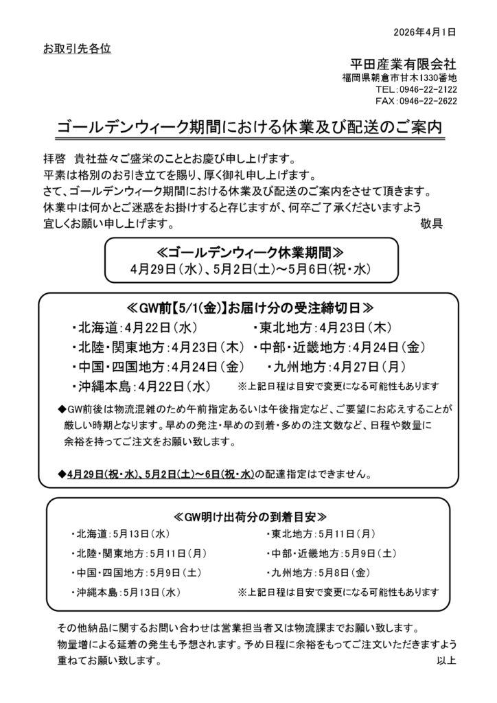 ゴールデンウィーク期間中の営業について - 平田産業有限会社